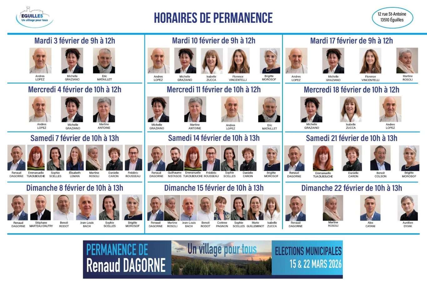 Pour échanger avec Renaud Dagorne (Un Village pour tous), voici le planning des permanences du mois de février 2026.