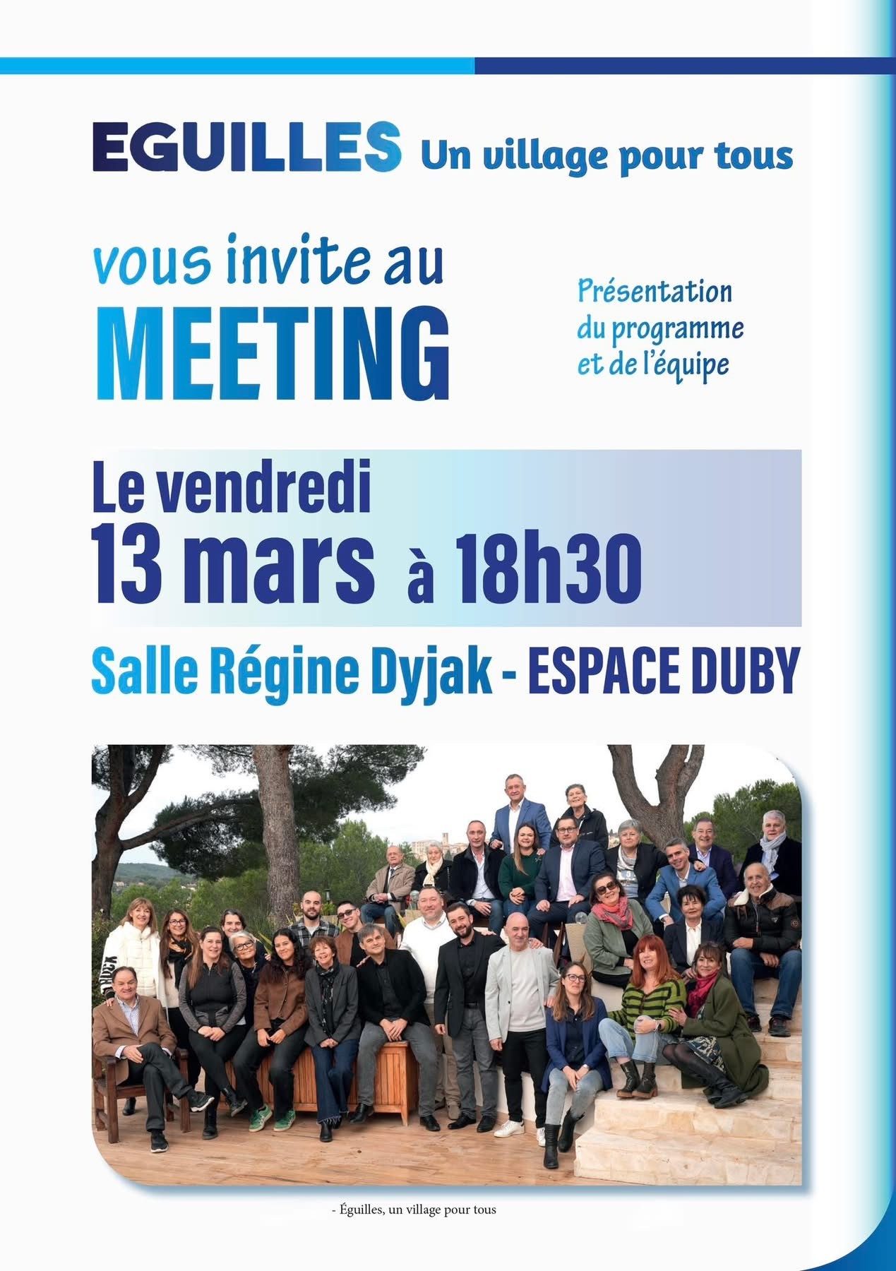 Une équipe heureuse de vous convier à l’espace Duby le vendredi 13 mars 2026 à 18h30 pour sa réunion publique.